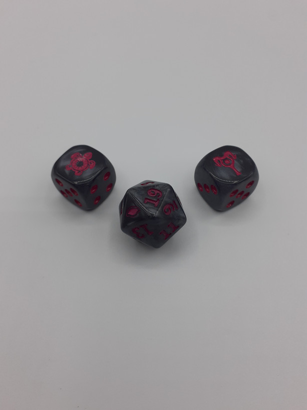 Dieses Set enthält 3 Schicksalspunkte mit dem Symbol des Gott Levthan, einen Götter- und einen Kha-Würfel, einen zwanzigseitigen Würfel sowie eine Anleitung zur Nutzung des Spielmaterials für eine Fokusregel zum Thema Schicksalspunkte.