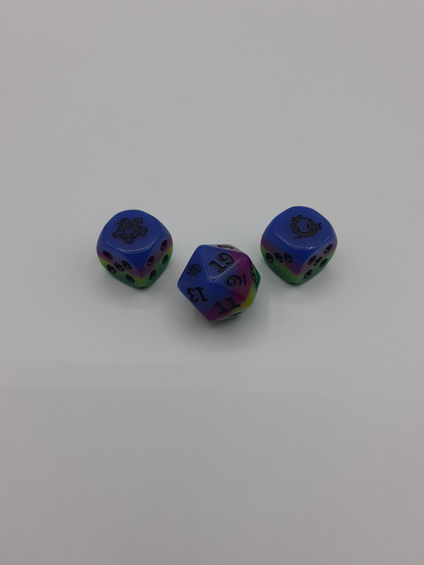 Dieses Set enthält 3 Schicksalspunkte mit dem Symbol der Göttin Tsa, einen Götter- und einen Kha-Würfel, einen zwanzigseitigen Würfel sowie eine Anleitung zur Nutzung des Spielmaterials für eine Fokusregel zum Thema Schicksalspunkte.
