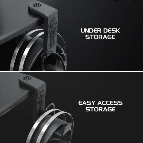 Der Headset-Ständer verfügt über einen vollständig verstellbaren und drehbaren Arm, mit dem Sie Ihre Kopfhörer unter Ihrem Schreibtisch aufbewahren können. Sie können ihn auch nach vorne schwenken, um Ihre Kopfhörer zur schnellen Aufbewahrung einfach auf dem Arm zu platzieren. Die Klemme lässt sich öffnen, um Schreibtische mit einer Dicke von 10 mm bis zu 40 mm aufzunehmen.