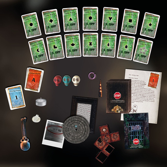 Inhalt: 1 Decodier-Scheibe, 118 Karten, 5 seltsame Teile, 1 Brief, 1 Polaroid, 1 verschlossenes Poster, 3 Schädel, 1 Teelicht, 1 verschlossene Kiste, 1 Standfuß, 1 Spielanleitung