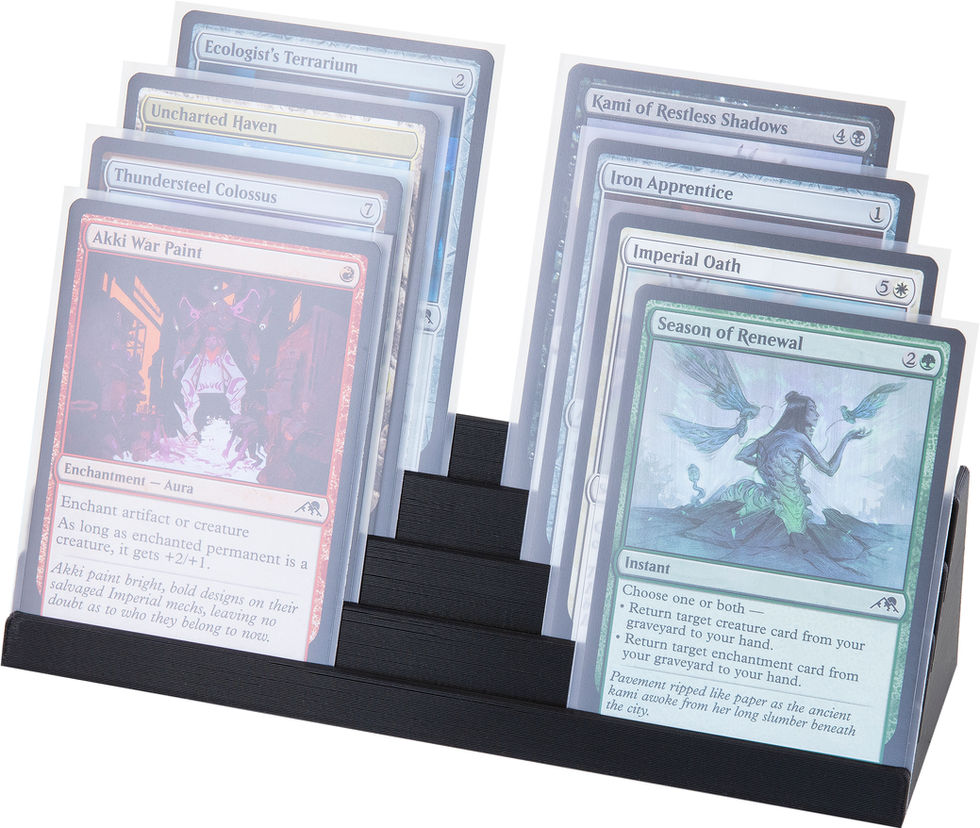 Je nach Kartentyp lassen sich unterschiedlich viele Karten nebeneinander aufstellen. Bei Standardkarten passen drei Karten nebeneinander. Insgesamt lassen sich so 12 Standardkarten pro Kartenhalter aufstellen.