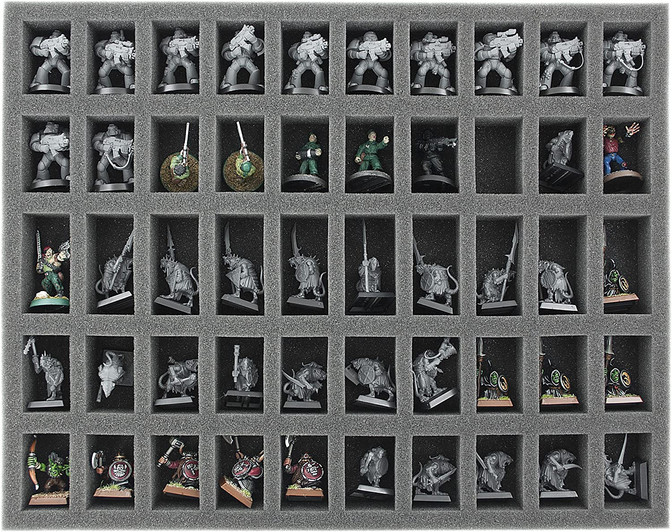 Feldherr Miniaturentasche für 150 Figuren und viele große Panzer oder Monster. Die Tasche wird mit 4 Schaumstoffeinlagen geliefert. In der 60 mm hohe Rasterschaumstoffeinlage lassen sich Panzer, Monster oder andere große Figuren problemlos verstauen. Der Rasterschaum lässt sich dabei ohne Werkzeug an nahezu jede Figurenform anpassen. In die 3 Einlagen für jeweils 50 Figuren passen nahezu alle Figuren - wie zum Beispiel für die Spiele Warhammer Fantasy, 40.000 oder Herr der Ringe - die auf einer 25mm Base (Platte) stehen.