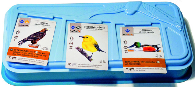 170 Vogelkarten bilden den Kern des Spieles Flügelschlag. Die Spieler sammeln diese Karten und versuchen daraus starke Kombinationsketten auf ihren Spieltableaus zu legen. Drei verschiedene Lebensräume stehen für drei Kombinationsketten, die gebildet werden können und die bei Aktivierung unterschiedliche Aktionen auslösen. Wechselnde Rundenziele, Bonuskarten und nicht zuletzt die illustrierten 170 Vogelkarten machen das Spiel dauerhaft abwechselungsreich. Die Austattung der Spielertableaus, Kartenablage, Miniatureier und einem Vogelhäuschen als Würfelturm ist sehr opulent.