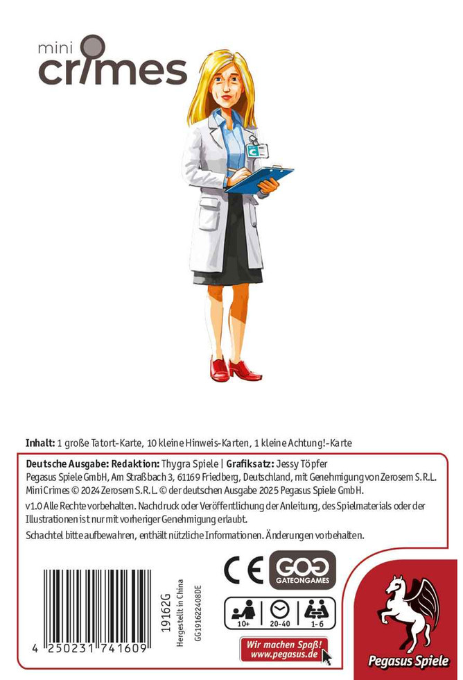 Die MiniCrimes Fälle sind kooperative Krimispiele, in denen die Spielenden ihre Beobachtungsgabe und ihre detektivischen Fähigkeiten unter Beweis stellen müssen, um einen mysteriösen Fall zu lösen. Sie untersuchen dabei den Tatort und bis zu 10 Hinweise, die sie mit Bedacht auswählen müssen, um das Geheimnis zu lüften!
