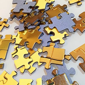 Hier wird den Puzzlefans eine Aufgabe von besonderer Kniffligkeit geboten: Das Motiv ist das Bild eines fertig gelegten, aber 3D-verformten Puzzles mit metallisch glänzender Oberfläche. Jedoch, verflixt: Die Konturen, die man im verformten Motiv sieht, haben nichts mit den wahren Stanzkonturen des eigentlichen 1000-Teile Puzzles darunter zu tun. Ein teuflisch schwerer Legespaß beginnt...