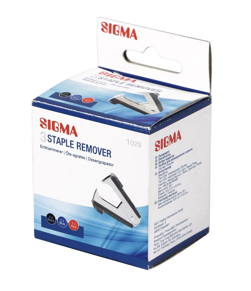 Der SIGMA RE01 Heftklammerentferner ist ein praktisches Werkzeug zum Entfernen von Heftklammern. Er ist mit einem Verriegelungsknopf ausgestattet, der eine sichere Aufbewahrung gewährleistet. Jeder Entferner hat die Abmessungen 60 x 26 x 31 mm und ein Nettogewicht von 26,8 g. Mit diesem hochwertigen Heftklammerentferner können Sie mühelos Heftklammern von Ihren Dokumenten entfernen. Er ist ein unverzichtbares Werkzeug für das Büro, die Schule oder zu Hause. Jede Verpackungseinheit enthält 3 farbig sortierte (Schwarz/ Rot und Blau) Stück.