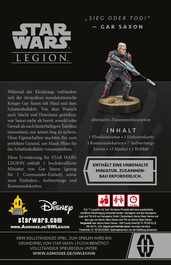 Die Erweiterung Gar Saxon für Star Wars™: Legion enthält eine hochdetaillierte Miniatur des skrupellosen mandalorianischen Kriegers Gar Saxon für eine Commander-Einheit sowie neue Einheiten-, Aufwertungs- und Kommandokarten. Er kann Mauls Armee der Söldner des Schattenkollektivs hinzugefügt werden.