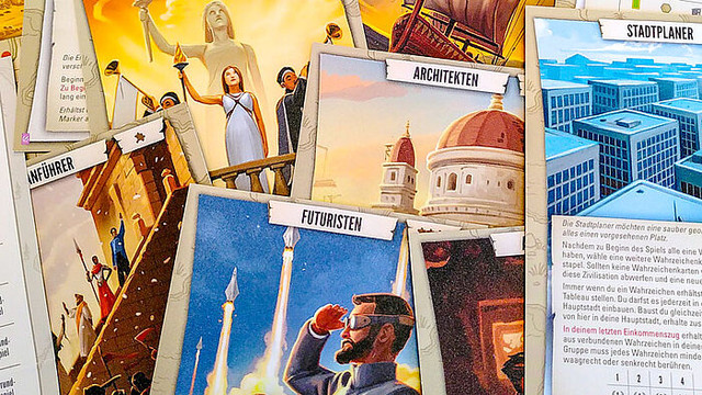 Enthält alle 31 final überarbeiteten Zivilisationstableaus aus dem Grundspiel, den Erweiterungen "Pläne und Gegenpläne" sowie "Kunst und Architektur" + 2 überarbeitete Hauptstädte