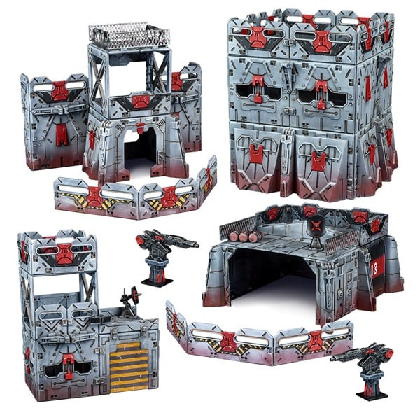 These fortified terrain tiles are perfect for building a sprawling military base, or many smaller armoured buildings. There are defence lasers, barricades, armour upgrades for walls and some industrial components to add variety to your structures.