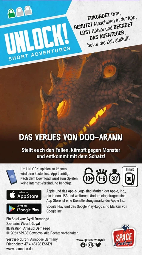 In Unlock! Short Adventures: Das Verlies von Doo-Arann müssen die Spieler einen kühlen Kopf bewahren, während sie Fallen umgehen und Monster bezwingen, um schließlich mit dem sagenumwobenen Schatz aus dem Verlies zu entkommen.