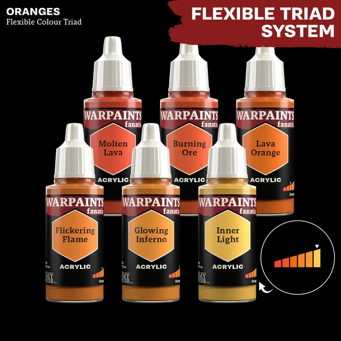 Each paint is part of a Flexible Colour Triad System: a segment, or family, of paint colours that are made using the same root colour. Inside each Flexible Colour Triad are six colours that range from dark to light with a consistent hue. With this system, you can easily select paints that create a natural colour progression on your miniatures.